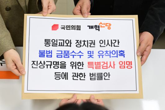 곽규택 국민의힘 의원과 이주영 개혁신당 의원이 지난 23일 국회 의안과에 통일교의 정치권 금품 지원 의혹 수사를 위한 특검법안을 제출하고 있다. 연합뉴스 |