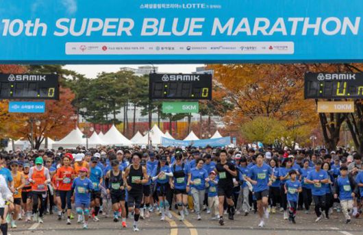 롯데가 지난달 서울 상암동 평화의공원 평화광장 일대에서 개최한 ‘제10회 슈퍼블루마라톤’ 행사에서 참가자들이 출발을 하고 있다. |