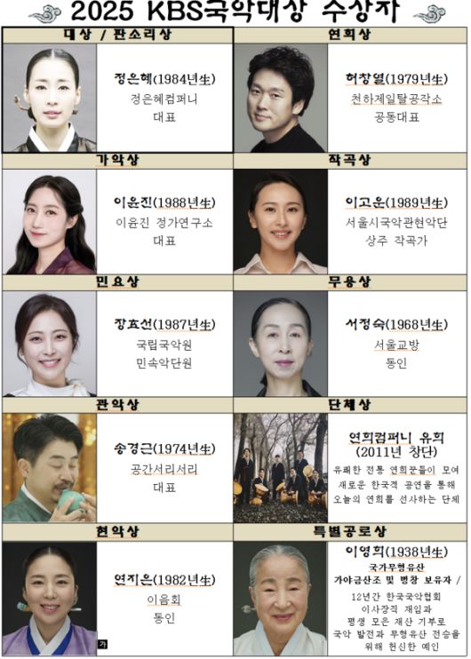 KBS국악관현악단과 서울시무용단의 축하 무대가 어우러진 '2025 KBS국악대상'은 12월 27일 토요일 낮 12시 10분부터 90분간 KBS 1TV를 통해 방송될 예정이다.