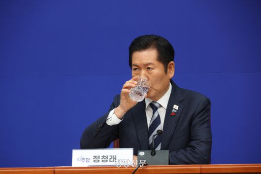 정청래 더불어민주당 대표가 26일 국회에서 취임 후 첫 공식 기자회견 도중 물을 마시고 있다. 2025.12.26 권도현 기자 |