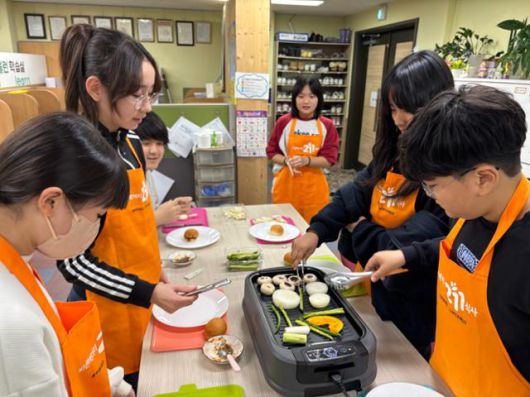 지난 1월 서울 구로구에 위치한 ’함께하는한숲 영문지역아동센터’ 아동들이 ‘한끼의 울림’ 기부 캠페인을 통해 전달받은 밀키트로 직접 요리를 하고 있다. CJ나눔재단 제공 |
