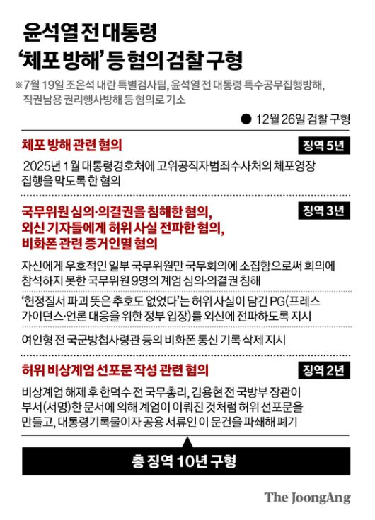 조은석 내란 특별검사팀은 26일 체포방해 혐의 등으로 기소된 윤석열 전 대통령에 대해 총 징역 10년을 구형했다.