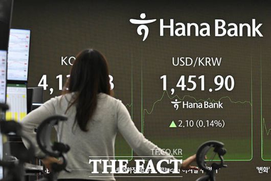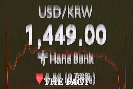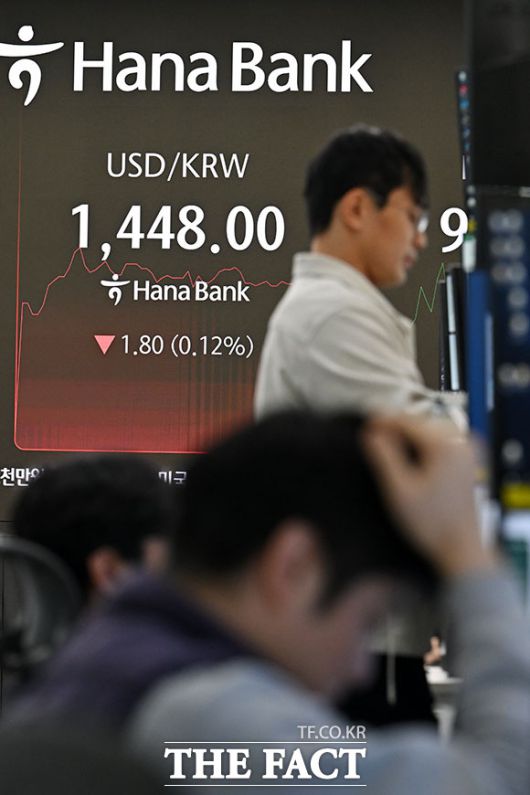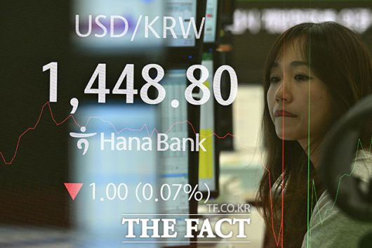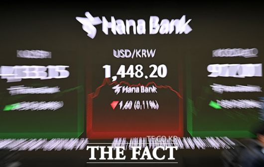이날 서울 외환시장에서 달러화 대비 원화 환율은 0.1원 오른 1449.2원에 개장해 곧바로 1450원대에 올랐지만, 하락세로 전환해 1440원 후반대에서 거래되고 있다.