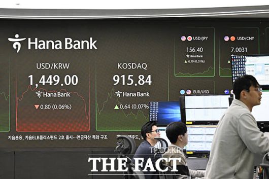 [더팩트ㅣ남용희·송호영 기자] 외환 당국의 개입으로 환율이 급락했던 가운데 26일 오전 서울 중구 을지로 하나은행 딜링룸 전광판에 지수가 나타나고 있다.
