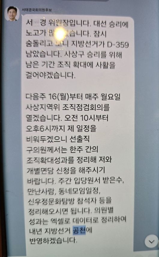 논란이 된 카톡 메시지에서 서 위원장은 "대선 승리에 노고가 컸다"고 언급한 뒤 “지방선거가 D-359 남았다”며 사상구 승리를 위해 조직 확대에 사활을 걸겠다고 밝혔다. 이어 매주 월요일 지역위원회 조직 점검 회의를 열고, 선출직 구의원들에게 한 주간의 조직 확대 성과를 정리해 보고하라고 요구했다.