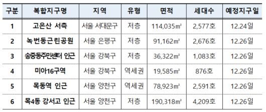 이번에 예정지구로 지정된 지역은 △목동역 인근 △목4동 강서고 일대 △고은산 서측 △녹번동 근린공원 일대 △송중동 주민센터 인근 △미아16구역 등 총 6곳이다. 전체 면적은 53만345㎡로, 공급 예정 물량은 1만4012가구에 이른다.