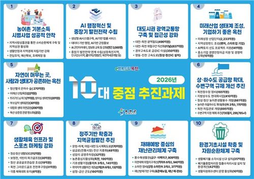 옥천군이 26일 2026년 군정 운영의 핵심 방향을 담은 10대 중점 추진과제를 발표하고, 군민 삶의 질 향상과 지속 가능한 지역성장을 위한 정책 추진에 나선다.