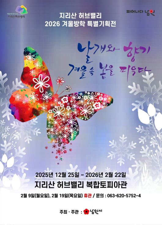 지리산허브밸리 겨울방학 특별기획전 '날개와 향기, 겨울 속 봄을 피우다' 포스터 [사진=남원시] |