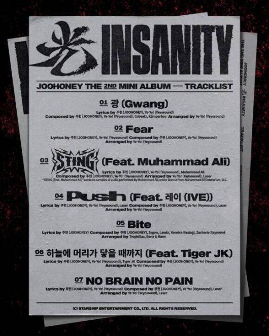 소속사 스타쉽엔터테인먼트는 지난 24일 몬스타엑스 공식 소셜 미디어에 주헌의 미니 2집 '光 (INSANITY)(광 인새니티)'의 트랙리스트를 공개했다. 트랙리스트 이미지는 마치 복싱 경기 일정표를 나타낸 듯한 강렬한 비주얼로 시선을 사로잡는다.