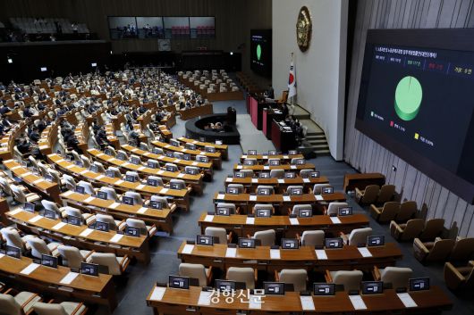 국회 본회의에서 더불어민주당 등 야당 단독으로 노란봉투법(노동조합 및 노동관계조정법 개정안)이 통과되고 있다. 문재원 기자 |