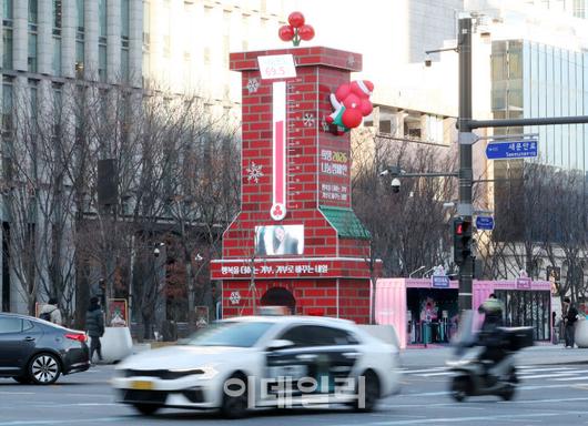 [이데일리 김태형 기자] 26일 서울 광화문네거리 ‘사랑의 온도탑’에 나눔온도가 69.5도를 나타내고 있다.