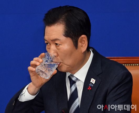 아시아투데이 송의주 기자 = 정청래 더불어민주당 대표가 26일 국회에서 열린 취임 첫 기자회견에서 물을 마시고 있다.