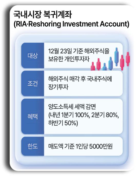 최근 기획재정부가 발표한 해외투자자의 ‘국내투자·외환안정 세제지원 방안’에서 핵심은 ‘국내시장 복귀계좌(RIA)’ 신설이다. 해외 주식투자가 고환율 주범으로 지목되면서 ‘투자 리쇼어링(본국 회귀)’을 장려하고자 마련됐다.