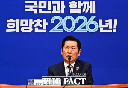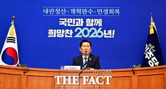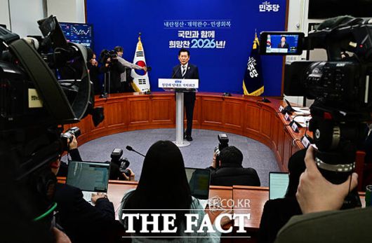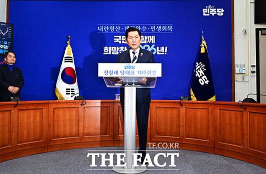 [더팩트ㅣ국회=배정한 기자] 정청래 더불어민주당 대표가 26일 오전 서울 여의도 국회에서 기자회견을 열고 모두발언을 하고 있다.