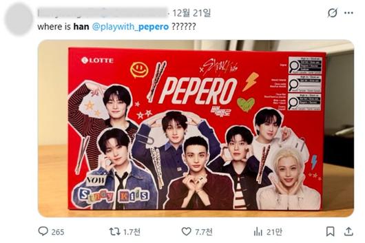캐나다에서 판매된 빼빼로와 스트레이 키즈 협업 패키지에서 멤버 한의 이미지가 빠진 사실이 알려지며 팬들의 반발이 이어지고 있습니다.