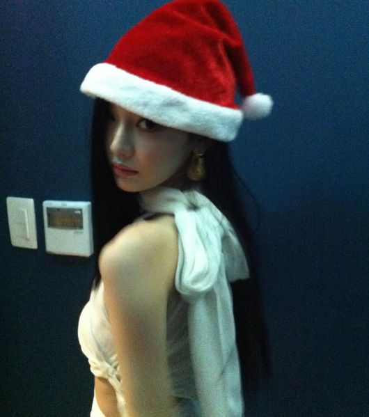 공개된 사진 속 닝닝은 크리스마스를 맞아 산타 모자로 일명 '소라게' 포즈를 취하고 있으며, 그와 대비되는 화이트 슬리브리스 드레스로 눈길을 끈다.