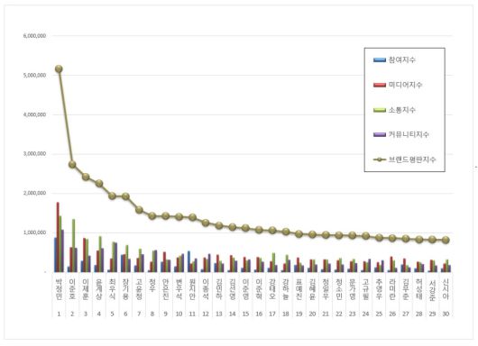 4위, 윤계상 브랜드는 참여지수 181,182 미디어지수 549,074 소통지수 914,864 커뮤니티지수 611,013이 되면서 브랜드평판지수 2,256,133으로 분석됐다.