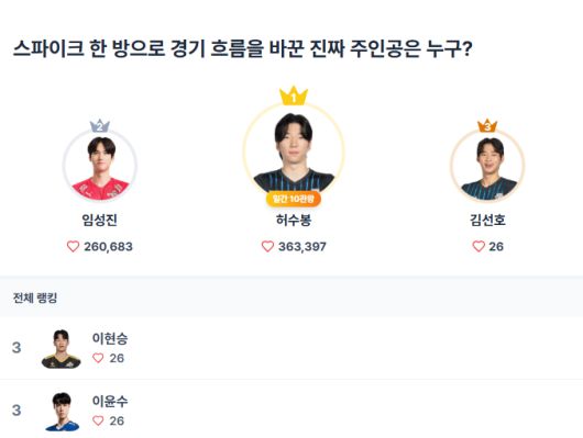 지난 24일 기준으로 진행된 이번 투표에서 허수봉은 36만 표가 넘는 득표를 기록하며 팬들의 높은 지지를 받았다.