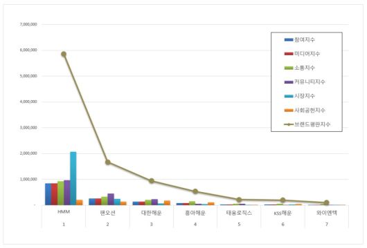 해운 상장기업 브랜드평판 1위를 기록한 HMM 브랜드는 참여지수 842,177 미디어지수 842,177 소통지수 924,173 커뮤니티지수 966,543 시장지수 2,065,506 사회공헌지수 212,424가 되면서 브랜드평판지수 5,852,999로 분석됐다. 지난 11월 브랜드평판지수 6,224,112와 비교해보면 5.96% 하락했다.