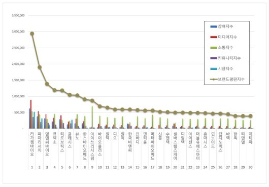 3위, 엘앤씨바이오 브랜드는 참여지수 316,294 미디어지수 450,760 소통지수 304,388 커뮤니티지수 185,252 시장지수 129,677이 되면서 브랜드평판지수 1,386,371로 분석됐다. 지난 11월 브랜드평판지수 1,049,497과 비교해보면 32.10% 상승했다.