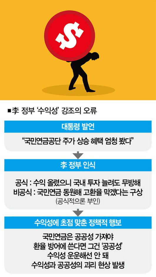 하지만 여기에 "국민연금도 주가 상승의 덕을 봤다"는 식으로 수익성을 꺼내 들면 엇박자가 난다. 국민연금이 주가 상승의 혜택을 보든, 해외투자에서 커다란 수익을 봤든 이는 '국민연금을 환율 방어에 사용해도 괜찮으냐'는 논쟁의 전제가 돼선 안 된다는 거다.