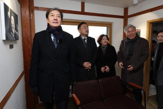 조국(맨 왼쪽) 조국혁신당 대표가 26일 전남 목포시 만호동에 있는 '소년 김대중 공부방'을 방문해 둘러보고 있다. 목포=연합뉴스 |