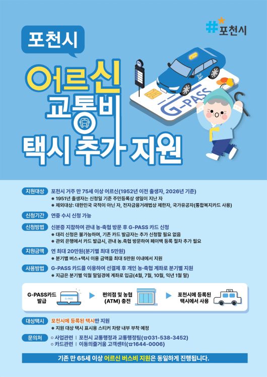 [헤럴드경제=박준환 기자]포천시는 2026년부터 만 75세 이상 어르신을 대상으로 ‘포천시 만 65세 이상 어르신 교통비 지원사업’에 택시 이용을 추가 지원한다고 26일 밝혔다.