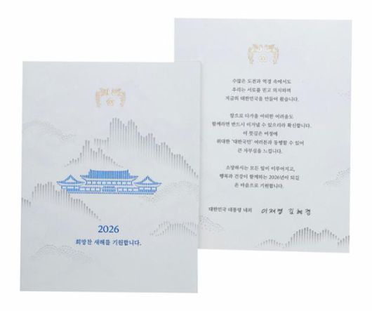이 대통령은 연하장에서 "수많은 도전과 역경 속에서도 우리는 서로를 믿고 의지하며 지금의 대한민국을 만들어 왔다"며 "앞으로 다가올 어떠한 어려움도 함께라면 반드시 이겨낼 수 있을 것이라고 확신한다"고 밝혔다. 이어 "이 뜻깊은 여정을 위대한 '대한국민' 여러분과 동행할 수 있어 큰 자부심을 느낀다"면서 "소망하는 모든 일이 이뤄지고 행복과 건강이 함께하는 2026년이 되기를 온 마음으로 기원한다"고 덧붙였다.