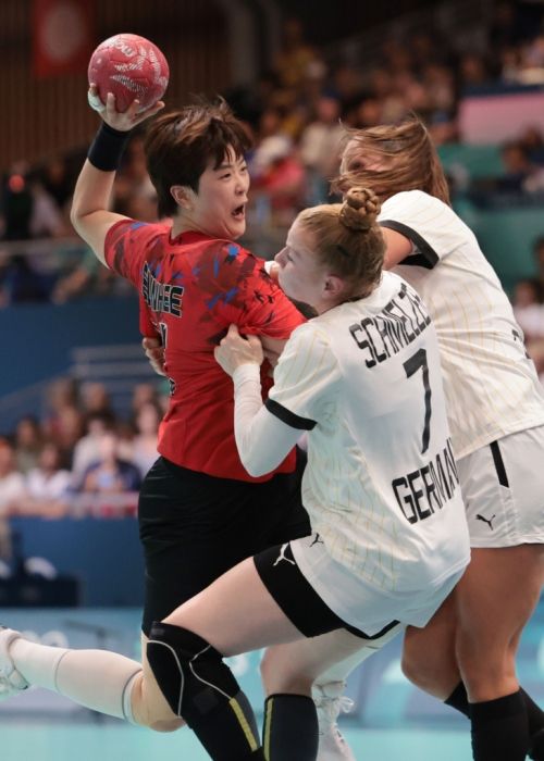 류은희(왼쪽)가 지난해 7월 사우스 파리 아레나 6에서 열린 핸드볼 여자 조별리그 A조 1차전 독일과의 경기에서 공을 던지고 있다. 파리 연합뉴스 |