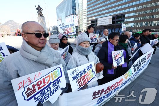 (서울=뉴스1) 김민지 기자 = 대한불교조계종 사회노동위원회·원불교 인권위원회·천주교서울대교구 노동사목위원회·한국기독교교회협의회 교회와사회위원회가 26일 오전 서울 종로구 광화문광장에서 쿠팡 김범석 의장의 '직접 사과'와 정부의 '강제수사'를 촉구하는 4대종교 입장문 발표 기자회견을 하고 있다. 2025.12.26/뉴스1