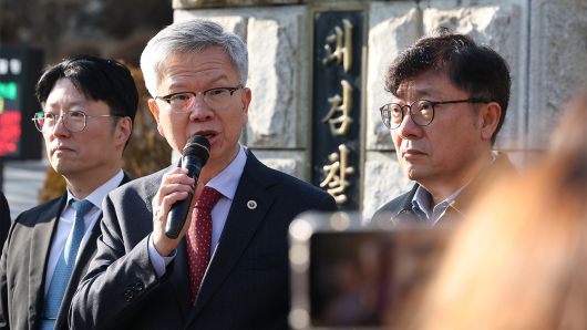 ▲ 12일 서울 서초구 대검찰청 앞에서 열린 '의대증원 절차 감사원 감사 결과에 따른 전 대통령 등 형사 고발 기자회견'에서 김택우 대한의사협회 회장(가운데)이 발언하고 있다.