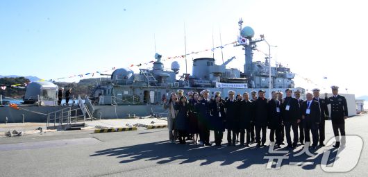 (창원=뉴스1) 윤일지 기자 = 26일 경남 창원 진해구 진해 군항에서 열린 국산 초계함 광명함(PCC·1000톤급) 전역식에서 김경률 해군작전사령관, 광명함 역대 함장 등 참석자들이 기념촬영을 하고 있다. 광명함은 포항급 22번째 초계함으로, 1989년 코리아타코마 조선소에서 건조 후 1990년 7월 취역해 제5성분전단 배치를 시작으로 제1함대사령부, 제3함대사령부 등에서 해역 방어 업무를 수행해 왔다. 76㎜ 및 40㎜ 함포, 대함미사일, 경어뢰 등의 무장을 갖추고 있으며, 1998년 12월엔 전남 여수 앞바다로 침투한 북한 반잠수정을 7시간 추적 후 함포사격으로 격침하기도 했다. 이런 노하우에 기반해 2017년엔 해군 포술 최우수 전투함인 '탑건함'으로 선발됐다. 2025.12.26/뉴스1
