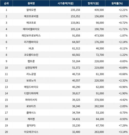 26일 한국거래소에 따르면, 시가총액 1위인 알테오젠(196170)은 현재가 439,500원으로 전 거래일 대비 2.21% 상승하며 안정적인 모습을 보이고 있다. 시가총액은 23조 5158억원으로, 외국인비율 14.09%, PER 187.18배, ROE 29.52%를 기록하며, 거래량은 477,455주를 기록 중이다. 에코프로비엠(247540)은 현재가 156,800원으로 전 거래일 대비 0.57% 하락세를 보이고 있으며, 시가총액 15조 3352억원, 외국인비율 11.73%, PER 4900.00배, ROE -6.26%로 평가되고 있다. 거래량은 167,681주를 기록 중이다.