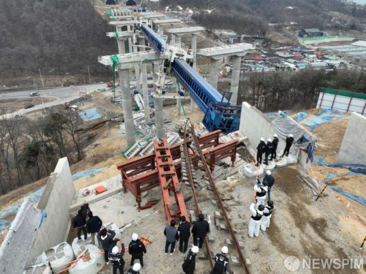 10명의 사상자가 발생한 경기 안성시 서울세종고속도로 건설 공사 교량 붕괴 사고 현장에서 28일 관계자들이 합동감식을 진행하고 있다. [사진=뉴스핌 DB] |