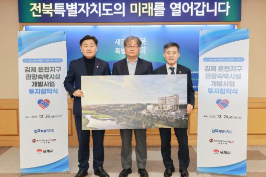 전북자치도는 26일 도청 회의실에서 김제시, 베스트웨스턴플러스 김제호텔과 함께 '김제 온천지구 관광숙박시설 개발사업 투자협약(MOU)'을 체결했다고 밝혔다.