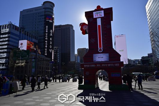 (서울=국제뉴스) 안희영 기자 = 올 겨울 최강의 한파가 기승을 부리고 있는 26일 정오께 서울시 종로구 광화문광장과 서울광장스케이트장, 청계천 일대의 체감기온이 영하 12.8도를 기록했다. 사무실과 호텔, 상가 등에는 난방 가동으로 인한 대형 연기가 모락모락 피어오르며 최강 한파의 여파를 여실히 드러냈다. 한편 금일 사회복지공동모금회 사랑의 열매는 나눔온도 77.3도를 기록하며 전국 모금액이 3,479.8억 원이 집계 되었다.