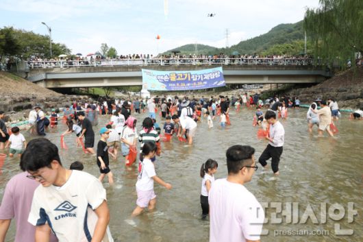 ▲ '제13회 완주와일드&로컬푸드축제' 기간 고산자연휴양림 일원에서 열린 ‘맨손물고기잡기 체험’ 모습. 관광객들이 물속에서 직접 물고기를 잡으며 축제를 즐기고 있다. ⓒ완주군 |