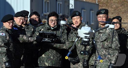 (서울=뉴스1) 국회사진기자단 = 우원식 국회의장이 26일 오전 경기 양평군 옥천면 제11기동사단 108기계화보병대대를 방문, 부대에서 운용 중인 드론 조종 체험을 하고 있다. 2025.12.26/뉴스1