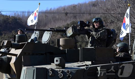 (서울=뉴스1) 국회사진기자단 = 우원식 국회의장이 26일 오전 경기 양평군 옥천면 제11기동사단 108기계화보병대대를 방문, K2 전차에 탑승해 부대내를 이동하고 있다. 2025.12.26/뉴스1