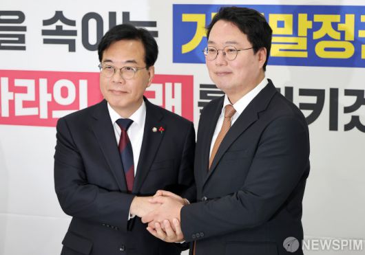 [서울=뉴스핌] 윤창빈 기자 = 송언석 국민의힘 원내대표(왼쪽)와 천하람 개혁신당 원내대표가 17일 오전 서울 여의도 국회에서 '통일교 특검법' 공동 발의를 논의하기 위한 회동에 앞서 악수하고 있다. 2025.12.17 pangbin@newspim.com |