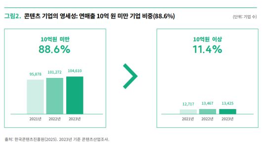 콘텐츠 기업의 영세성도 투자 활성화를 가로막는다. 2023년 기준 콘텐츠 기업의 88.6%가 연매출 10억 원 미만이다. 기업 단위의 재무 안정성이나 성장 스토리를 제시하기 어렵다 보니, 투자는 대기업 계열이나 플랫폼 중심으로 쏠릴 수밖에 없다.