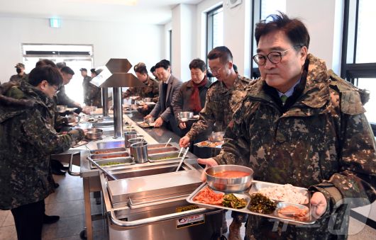 (서울=뉴스1) 국회사진기자단 = 우원식 국회의장이 26일 오전 경기 양평군 옥천면 제11기동사단 108기계화보병대대를 방문, 장병과의 오찬을 위해 부대내 식당에서 식판에 음식을 담아들고 이동하고 있다. 2025.12.26/뉴스1