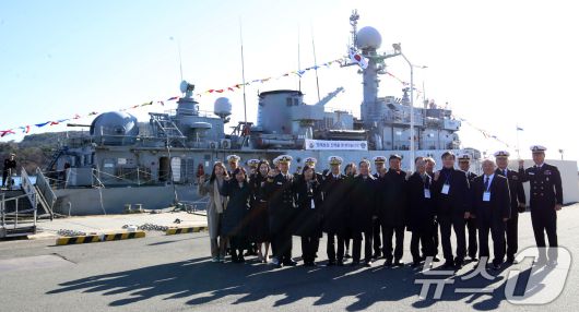 26일 경남 창원 진해구 진해 군항에서 열린 국산 초계함 광명함(PCC·1000톤급) 전역식에서 김경률 해군작전사령관, 광명함 역대 함장 등 참석자들이 기념촬영을 하고 있다. 2025.12.26/뉴스1 ⓒ News1 윤일지 기자 |