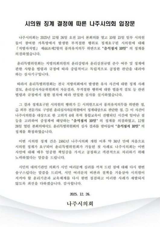 전남 나주시의회가 개원 이후 처음으로 현직 시의원에 대해 출석정지 징계를 확정했다. 26일 나주시의회는 오전 본회의를 열고, 일부 시의원이 카카오톡 단체 대화방에 부적절한 사진을 게시한 행위에 대해 지방자치법상 품위유지 의무 위반을 인정해 '출석정지 10일'의 징계안을 의결했다고 밝혔다.