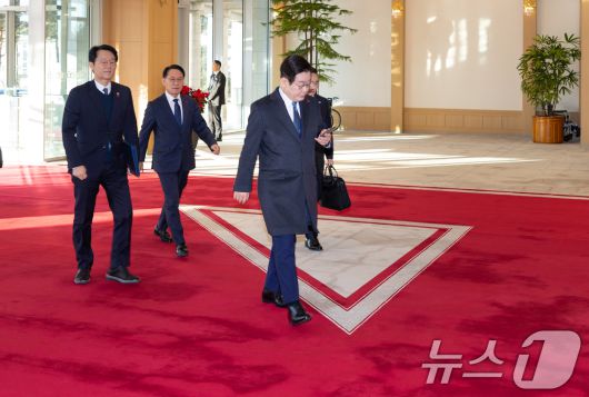 대통령실은 수행원들과 함께 이날 오전 용산 대통령실로 들어서는 이 대통령의 사진을 언론에 공개했다.