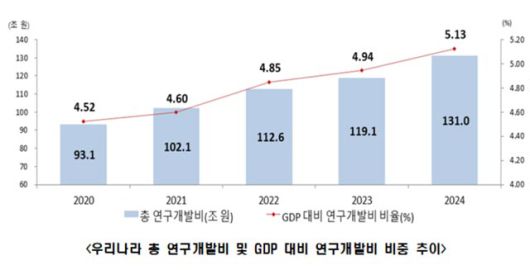 조사에 따르면 우리나라의 총 연구개발비는 131조462억원으로 전년 대비 11조9722억원(10.1%)이 증가했다. GDP 대비 연구개발비 비중은 5.13%로 이스라엘(2023년 6.35%)에 이어 세계 2위를 유지했다.