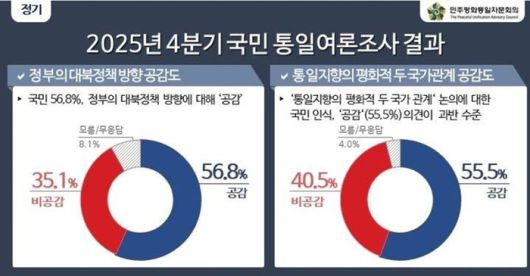 이재명 대통령이 이달 2일 제22기 민주평통 출범회의에서 ‘전쟁 걱정 없는 한반도’, ‘평화공존의 새 시대’, ‘남북 공동성장’ 등의 대북정책 방향을 제시한 데 대해서는 응답자 56.8%가 공감한다고 했다.