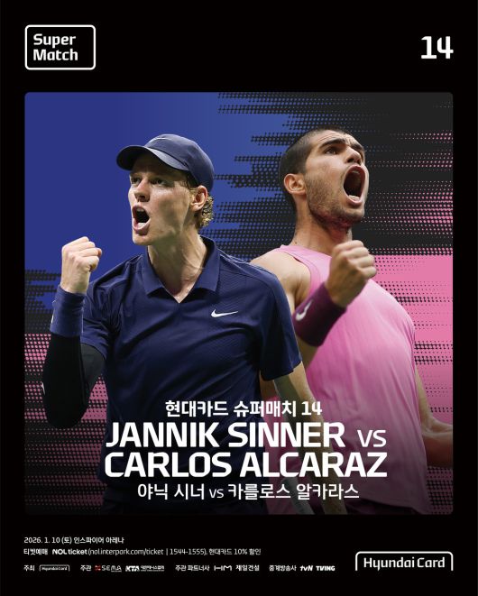 내년 1월 10일 인천 인스파이어 아레나에서 개최되는 현대카드 슈퍼매치 14는 현 테니스 세계랭킹 1, 2위 야닉 시너와 카를로스 알카라스가 나란히 내한해 펼치는 단 한 번의 특별한 매치.