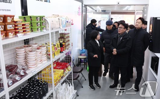 (서울=뉴스1) 김성진 기자 = 김민석 국무총리가 26일 서울 종로구 창신동 쪽방상담소 동행스토어 온기창고를 방문해 시설 운영에 대해 듣고 있다. 2025.12.26/뉴스1