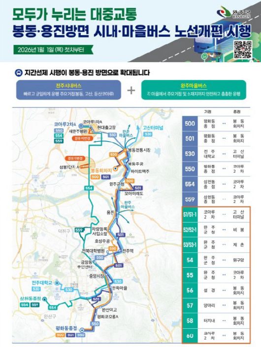 주요 변경 사항으로는 시내버스 500번과 501번 노선이 신설돼, 이번 개편으로 폐지되는 용진 방면 △54번 △55번 △56번 △57번 △58번 노선을 대체하게 된다. 해당 노선은 봉동회차지에서 평화동종점까지 운행되며, 각 마을에서 읍·면 소재지까지는 마을버스 56번과 58번이 운행된다.